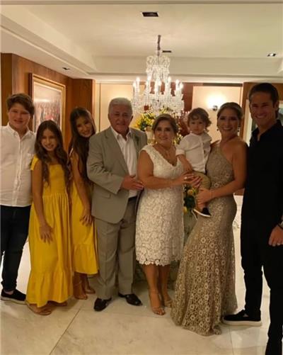 Em noite de muito frisson, tendo a família reunida e com direito a bênção especial do Pe. Leandro Duarte, Auricélia e Deusmar Queirós celebraram suas Bodas de Ouro, na última quinta-feira, dia 21. O momento festivo se deu no endereço do casal e contou com repertório musical de Márcio Campos e Nando Cordel. No clique, Auricélia e Deusmar com a filha Patriciana, genro David Rodrigues e netos Patrick, Vidda e Pietra.