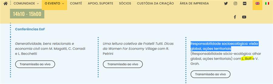 O evento Economia de Francisco acontece de 19 a 21 de novembro e conta com a participação de grandes expoentes da Teologia da Libertação. Com o objetivo de propor uma nova ordem econômica,chamada pelos especialistas de pós-capitalismo, o encontro acontece em Assis, na Itália, com transmissão pela internet, limitação imposta pela pandemia do novo coranvírus. Nesta sexta-feira, dia 20, dois brasileiros estão entre os palestrantes principais, Leonardo Boff e Padre Vilson Gronh. De acordo com o site oficial do evento, a dupla vai conversar com os participantes do fórum sobre o tema "Responsabilidade socioecológica: visão global, ações territoriais', no período da tarde.