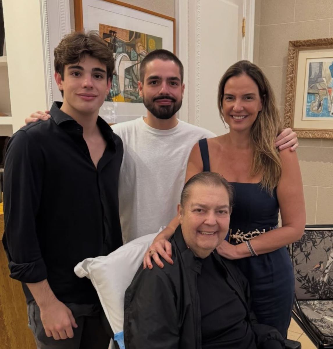 Na imagem, Faustão aparece sorridente, sentado em uma cadeira de rodas e apoiado por uma almofada nas costas, em um momento discreto e afetuoso. Conhecido por manter a vida pessoal longe dos holofotes, o comunicador fez uma rara aparição pública, o que gerou comoção entre internautas.