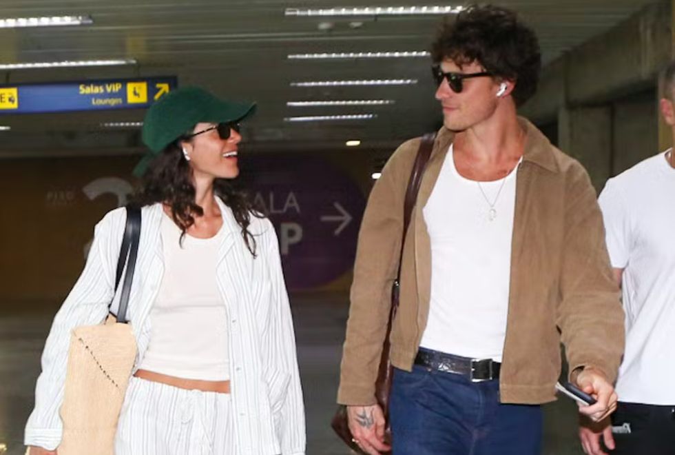 A talentosa atriz de 30 anos optou por uma camisa listrada com uma baby look white, uma calça larguinha na mesma estampa e um chinelo branco com pin dourado com as letras S e M – iniciais do nome do amado.