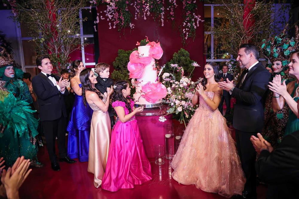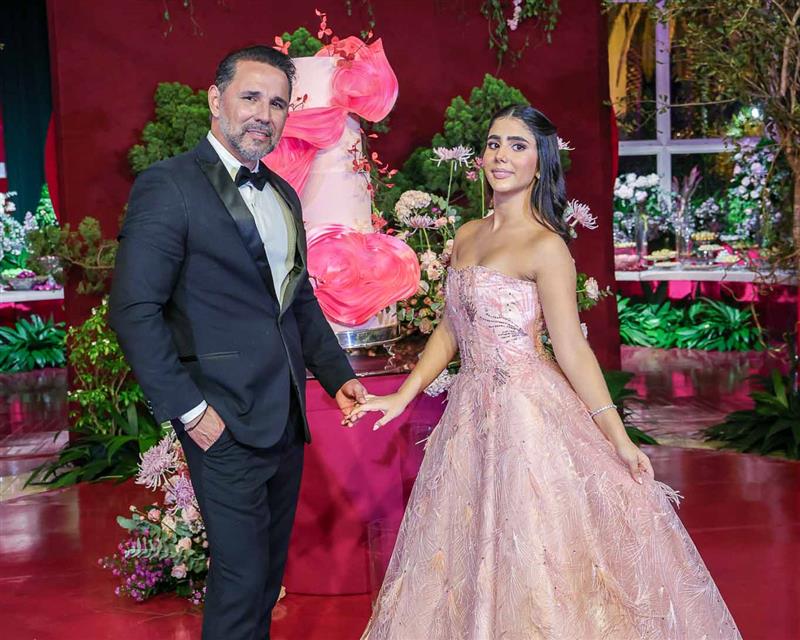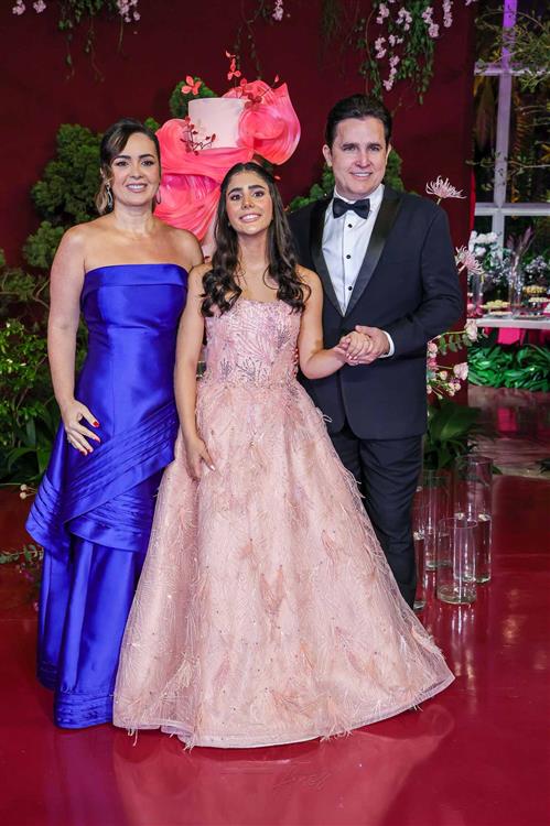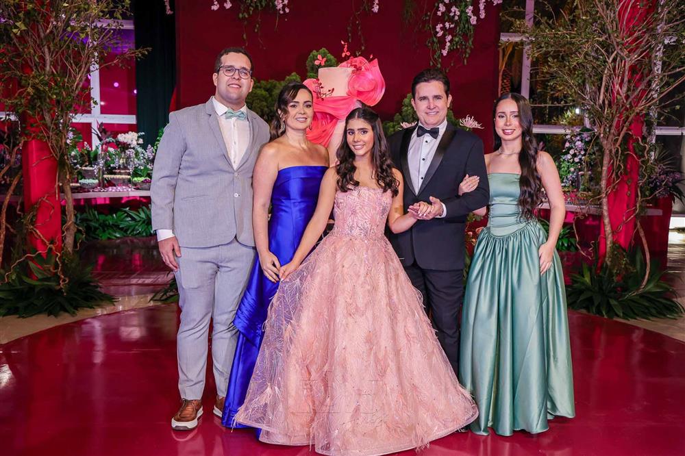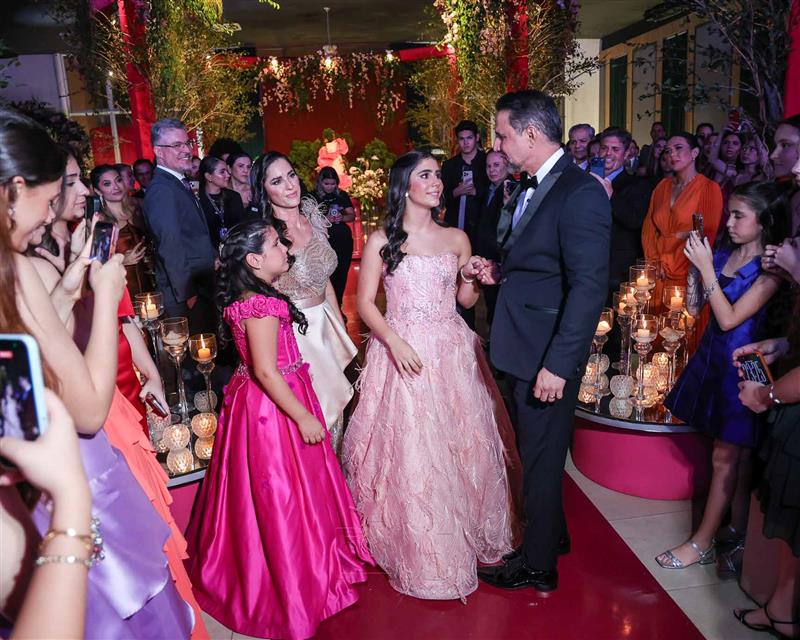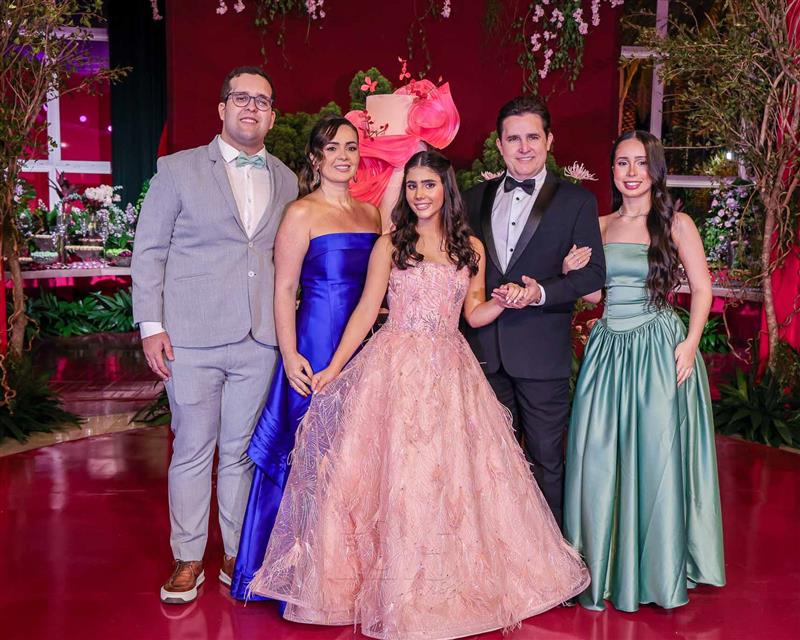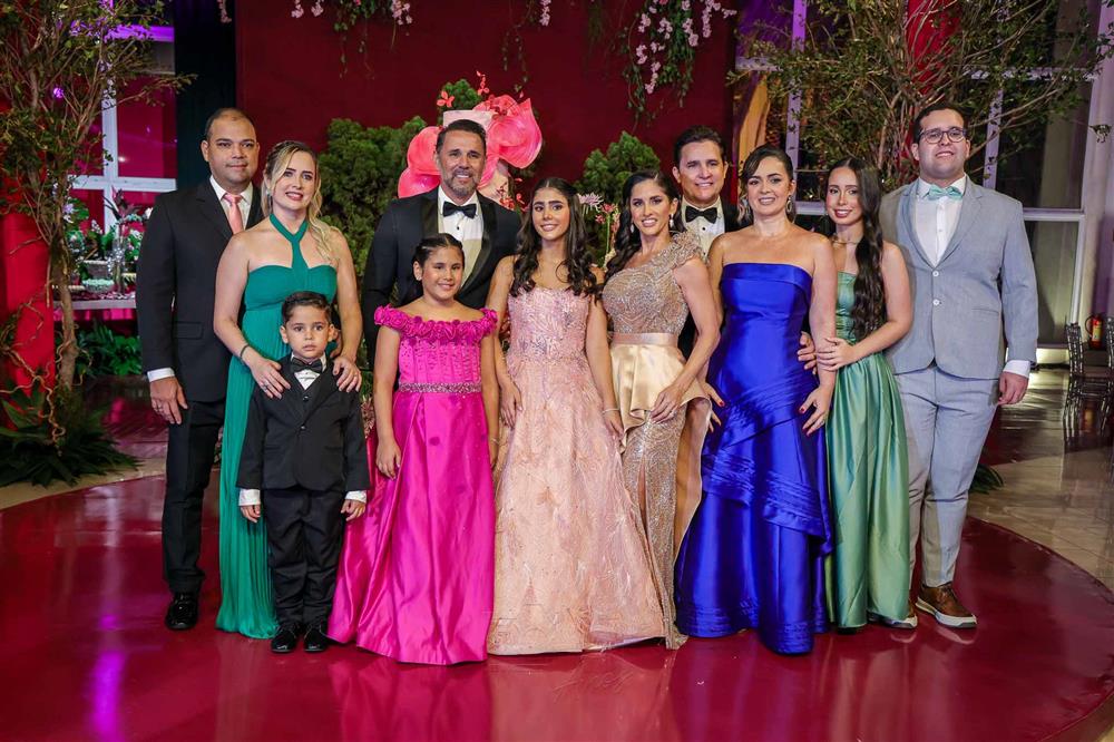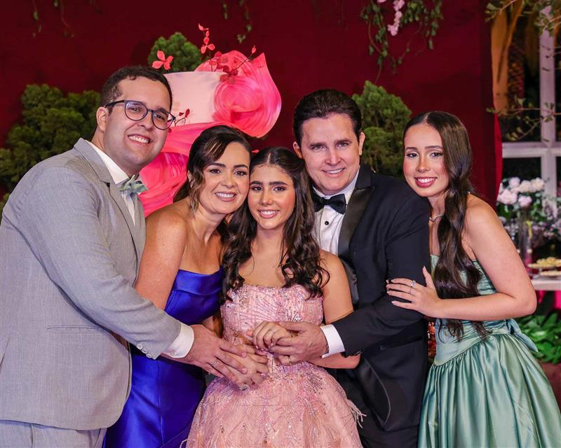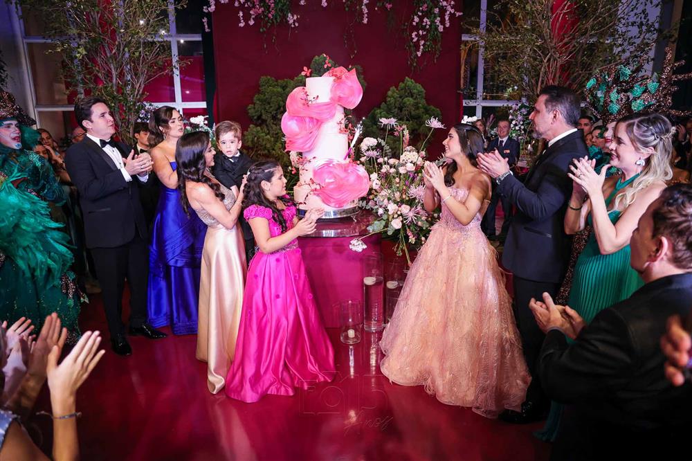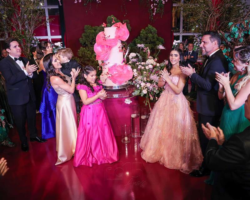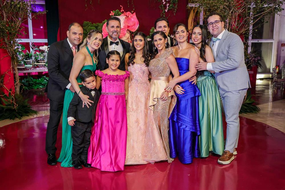 Débora e Giovanni Sá reuniram familiares e amigos para a celebração do baile debutante de Giovanna Sombra, tendo o Alice's Buffet como palco na noite de 14 de março de 2025.
