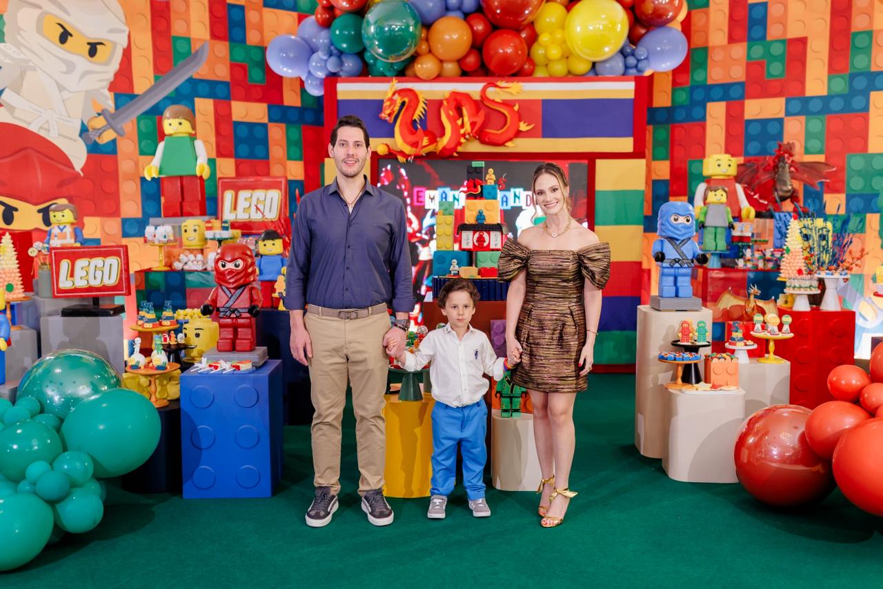 O cenário do parabéns também ganhou vida com as cores vibrantes na decoração desenvolvida por Geo Sá e inspirada no universo do Lego Ninjago. Cada detalhe refletiu os desejos do aniversariante e transportou todos os convidados para o mundo dos ninjas. Um frisson absoluto!